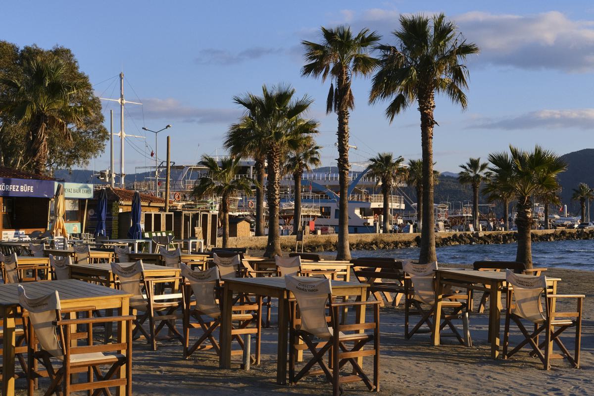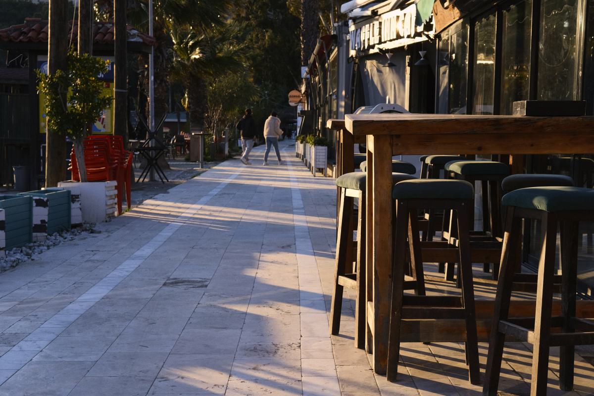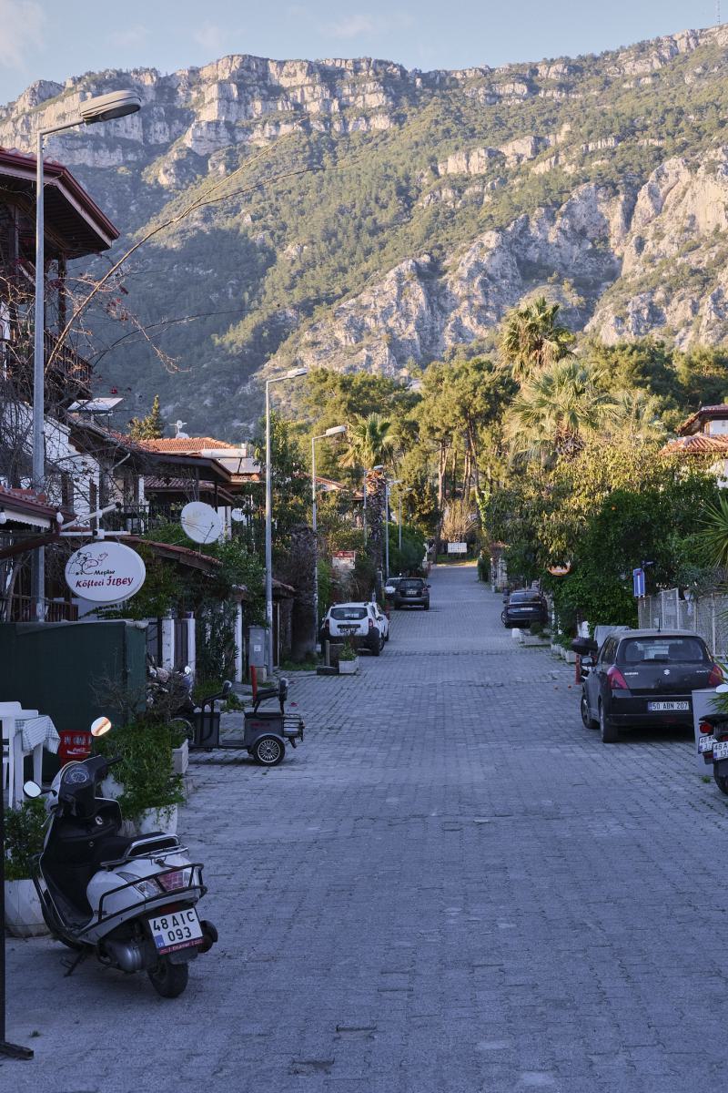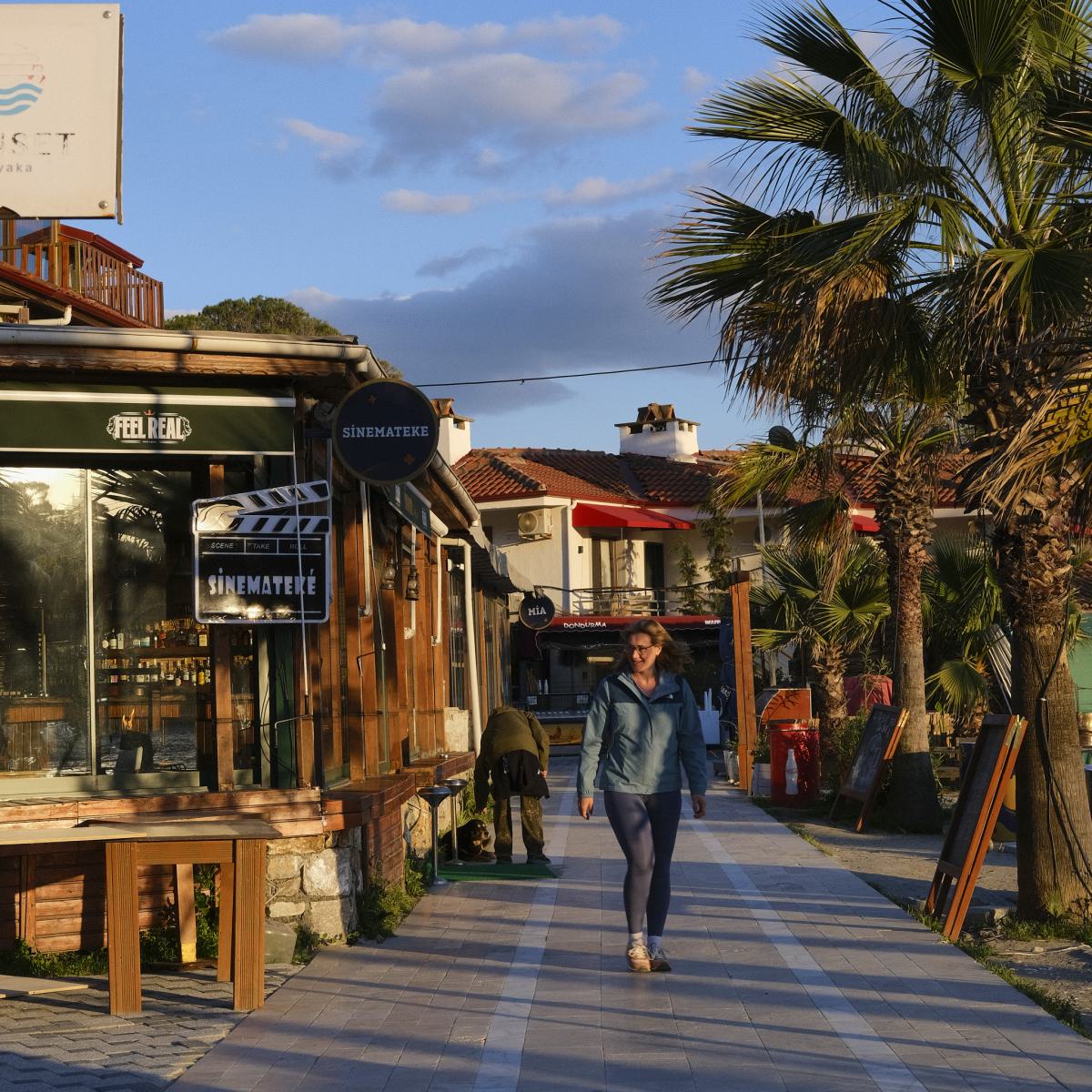 We continue southwards and stop briefly in Milas to buy some excellent fresh fruit and vegetables at the weekly market. Leaving Bodrum to the right, we now head up through the rugged mountains and back down to the coast, where we find a nice pitch near Ören, again by the sea. Unfortunately, the wind has picked up a lot these days (gusts of up to 60 km/h according to the app) and it has also become noticeably cooler. We somewhat regret having mothballed our thick blankets and clothes, but solve this inconvenience with a (reasonably prized) hotel stay in the nearby tourist town of Akyaka, which is not yet very busy at this time of year. After seven days without a hot shower (only the sea and beach showers…), this feels like pure luxury and reminds us once again how valuable hot running water, always available electricity from the socket and the security of four walls and a lockable door are, which we so often take for granted in everyday life, or even ignore.