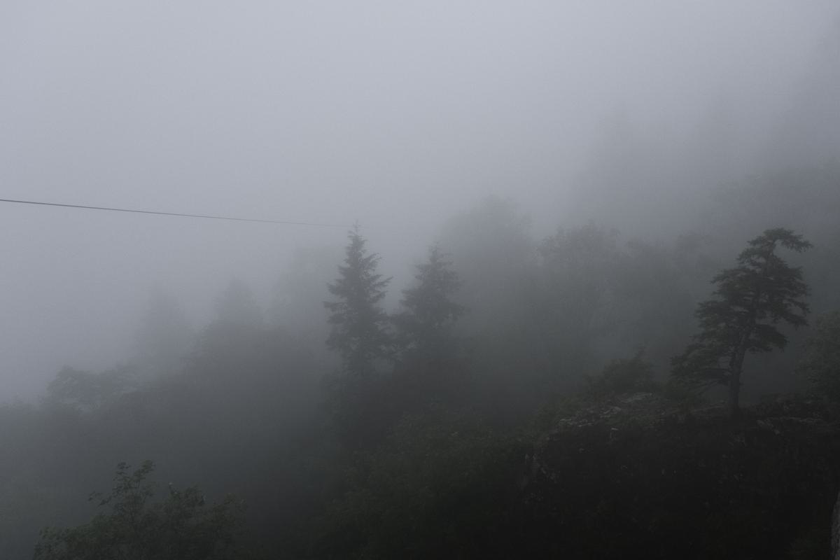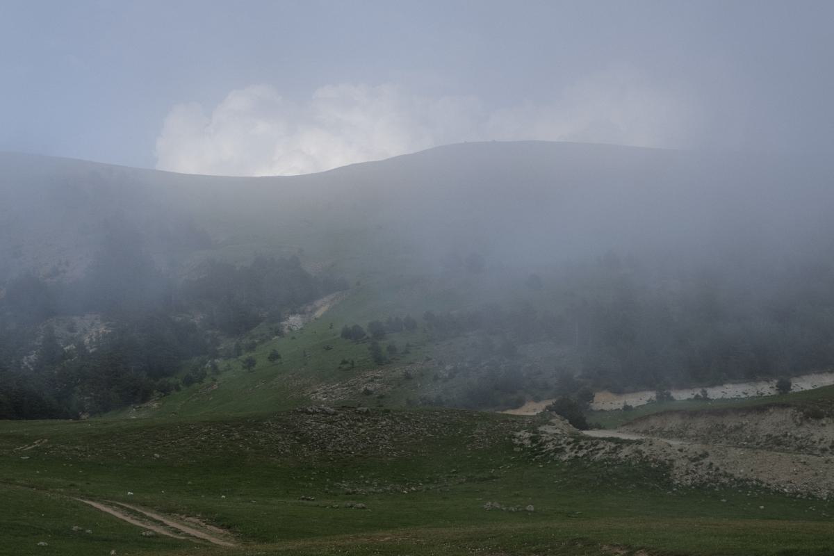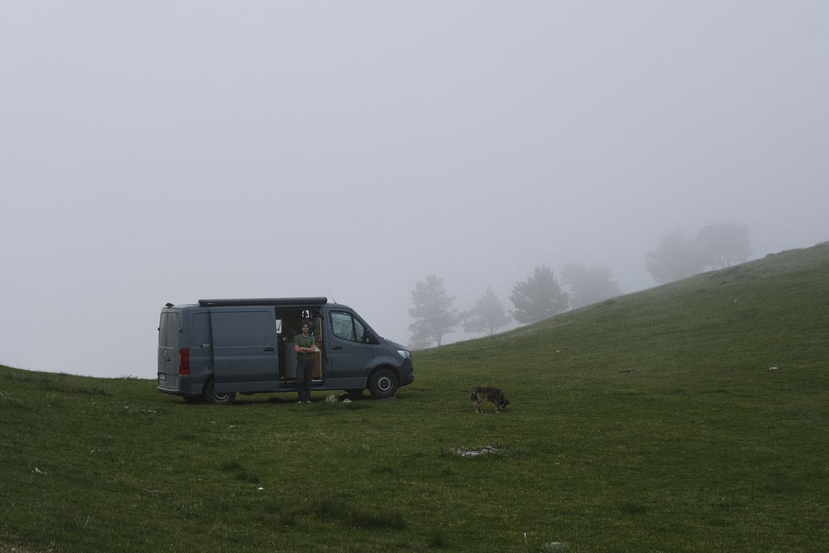 Afterwards, we drive further south into the mountains. This is more by chance, as we pick up a French hitchhiker who is trying to get to a remote mountain lake. Since we don’t have any better plans ourselves, we spontaneously decide to drive there and take her with us. It’s a win-win situation, because the atmosphere up there is breathtaking. The clouds are so thick the next morning that Svenja gets a little lost on her daily morning walk with Apollo…!