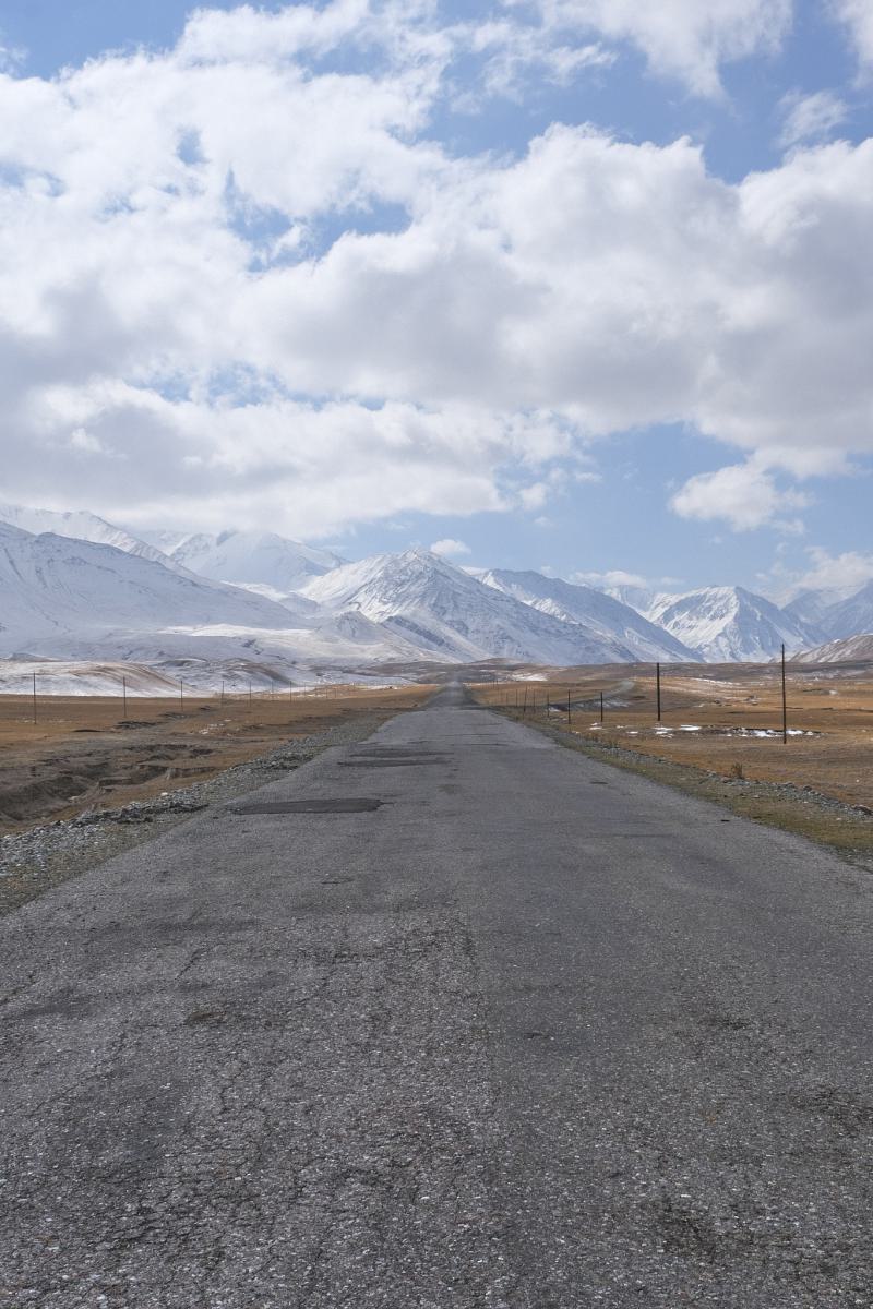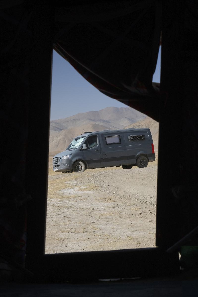 Soon, the dust settles, leaving us in a grey, arid landscape. It is eerily quiet and once again, it doesn’t feel like we’re on planet Earth, but rather on the Moon, albeit much brighter in the early afternoon light. We carry on and soon drive up towards the Kyzyl Art Pass again, which marks the border between Tajikistan and Kyrgyzstan. After an easy border crossing on the Tajik side, we drive on for about 20 km through no man’s land between the two border crossing points and reach the Kyrgyz border in the evening. Luckily, this one is also very straightforward and quick. A few kilometres after the border, we stop for the night.