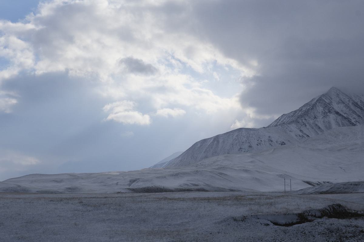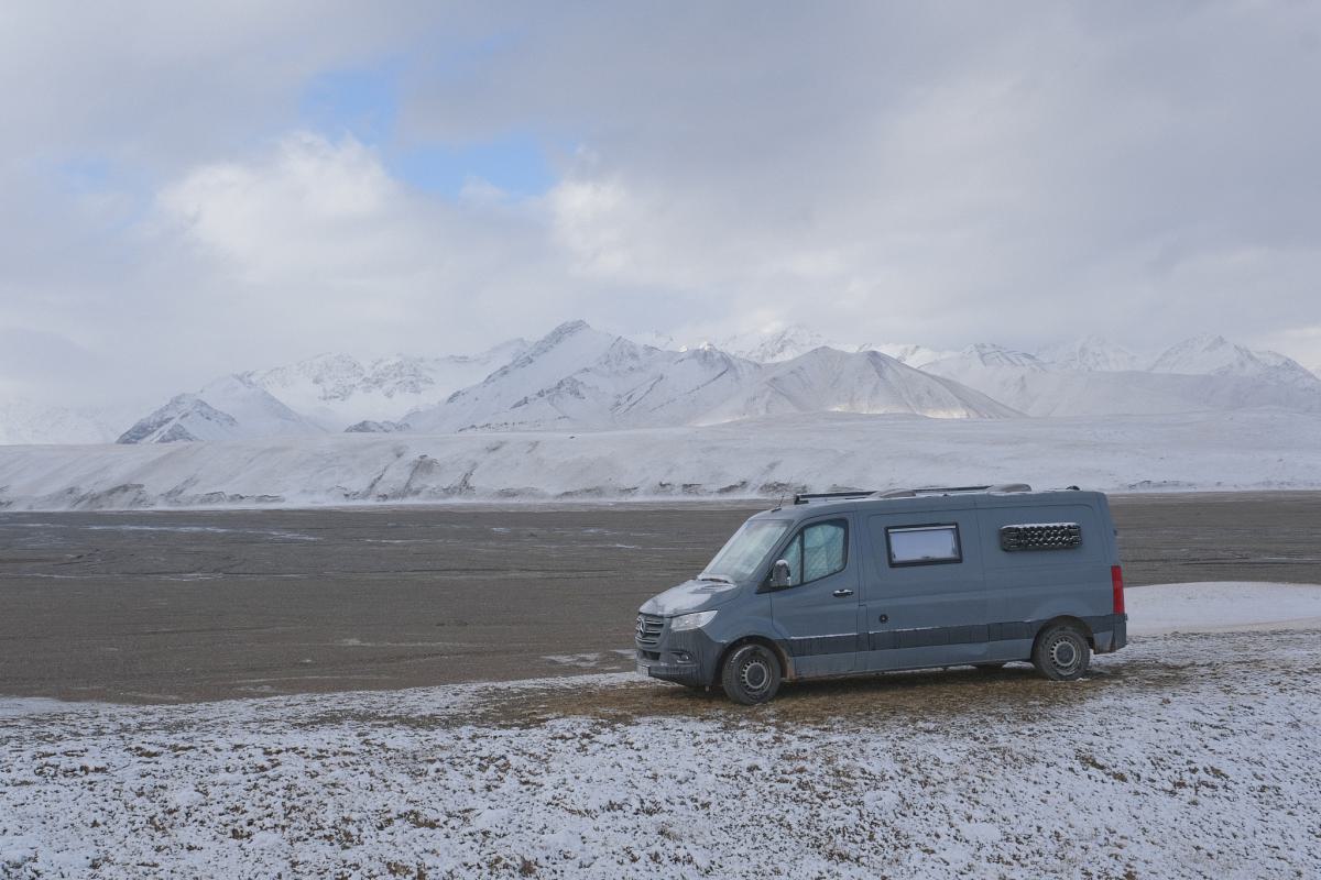 We soon realise that we had a good gut feeling about the weather at Karakul Lake when it starts to snow. The snowfall turns into a snowstorm overnight, and when we wake up, the world is completely different to how it was only yesterday. What a day! A hike at a beautiful mountain lake, a sandstorm, the highest border crossing we might ever make, and finally, a snowstorm. Kyrgyzstan, here we are!